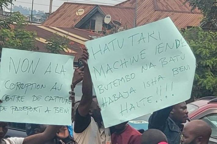 Le cortège, composé d’hommes, de femmes et de jeunes, a transformé les rues en un champ de revendications. Les pancartes, brandies comme des boucliers contre l’injustice, parlaient d’elles-mêmes : « Pas de trafic d’influence au centre de capture à Beni », « L’option de passeport est un droit », « Nous ne voulons pas que les machines partent à Butembo ». Chaque slogan est un cri du cœur, une peur concrète qui dépasse la simple logistique administrative. Les manifestants, organisés et déterminés, ne dénoncent pas seulement un déménagement. Ils pointent du doigt un risque systémique de trafic d’influence à Beni, de favoritisme et de corruption qui pourrait naître d’une centralisation des équipements ailleurs. « Centraliser à Butembo, c’est ouvrir la porte aux combines, affirme Marie, une commerçante. Ici, à Beni, on a nos habitudes, une certaine transparence. Là-bas, qui contrôlera ? Qui paiera pour être prioritaire ? »
